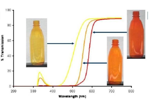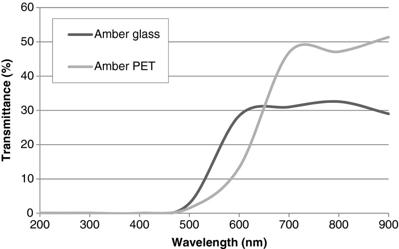 The filteration of amber PET and amber glass is quite similar. Based on this graph, PET can also decrease the visible light’s strength more than glass, but it may be affected by the thickness of the testing sample. The point is not at the visible light. The point is both amber PET and amber glass can filter UV with wavelength less than 400nm high-effectively.