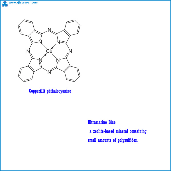 Blue. The main series of organic blue pigment is copper phthalocyanine. This series also include green color as well as blue color. The color strenght is strong but decrease when it is used toghther with TiO2. It is non-toxice (LD50 Oral – Rat > 2,000 mg/kg). Another blue pigment is an inorganic pigment named as Ultramarine Blue (Pigment Blue 29). It is a zeolite-based mineral container small amount of polysulfides. It is non-toxice (LD50 Oral – Rat > 10,000 mg/kg).