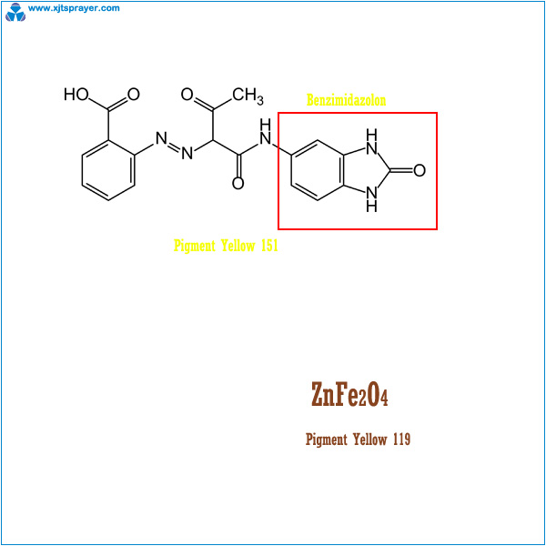 Yellow. Yellow color also includes many compounds. One organic colorant is Benzimidazolone series. Normally Benzimidazolone group connects to azo group to form the yellow colorant, such as pigment yellow 151. Pigment yellow 151 is non-toxic (LD50 Oral – Rat > 5,000 mg/kg). A general inorganic colorant is Zinc Ferrite Oxide. Acutally Zinc Ferrite colorant is almost brown instead of yellow. Toxicity of Zinc Ferrite colorant is LD50 Oral – Rat > 2,000 mg/kg.
